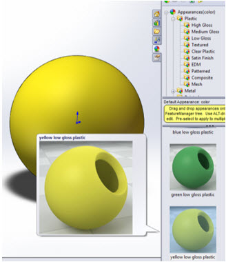 In this first example, I'll create a simple custom procedural appearance for a specific plastic color I use often--orange. To create a custom appearance, I first start with one of the existing appearances. I’m going to apply “yellow low gloss plastic” to my sphere geometry by double clicking the appearance in the Task Pane.