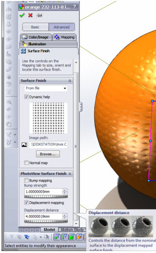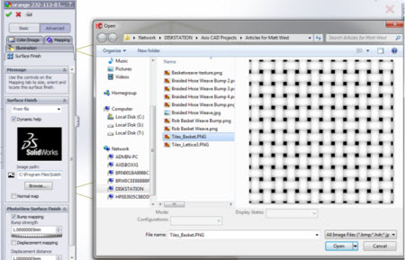 I’ll need to edit the “orange low gloss plastic” appearance, which I can do by clicking the right mouse button on the sphere and choosing the “edit orange low gloss plastic” option from the appearance drop down. In the appearance editor I’ll switch to the Surface Finish tab and choose the “From file” option. Now I’ll browse to a grayscale weave texture file.