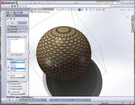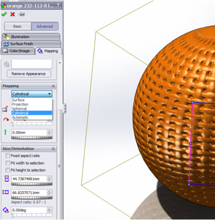 Now that my weave surface finish is applied, I’ll have to adjust the mapping so it displays correctly on my sphere. I switch to the Mapping tab, set the Mapping to “Cylindrical,” and adjust the size until it’s scaled correctly.