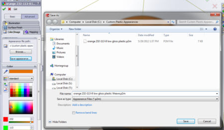 Switching back to the Color/Image tab, I can chose the option to “Save appearance.” I have now created a custom textural appearance.