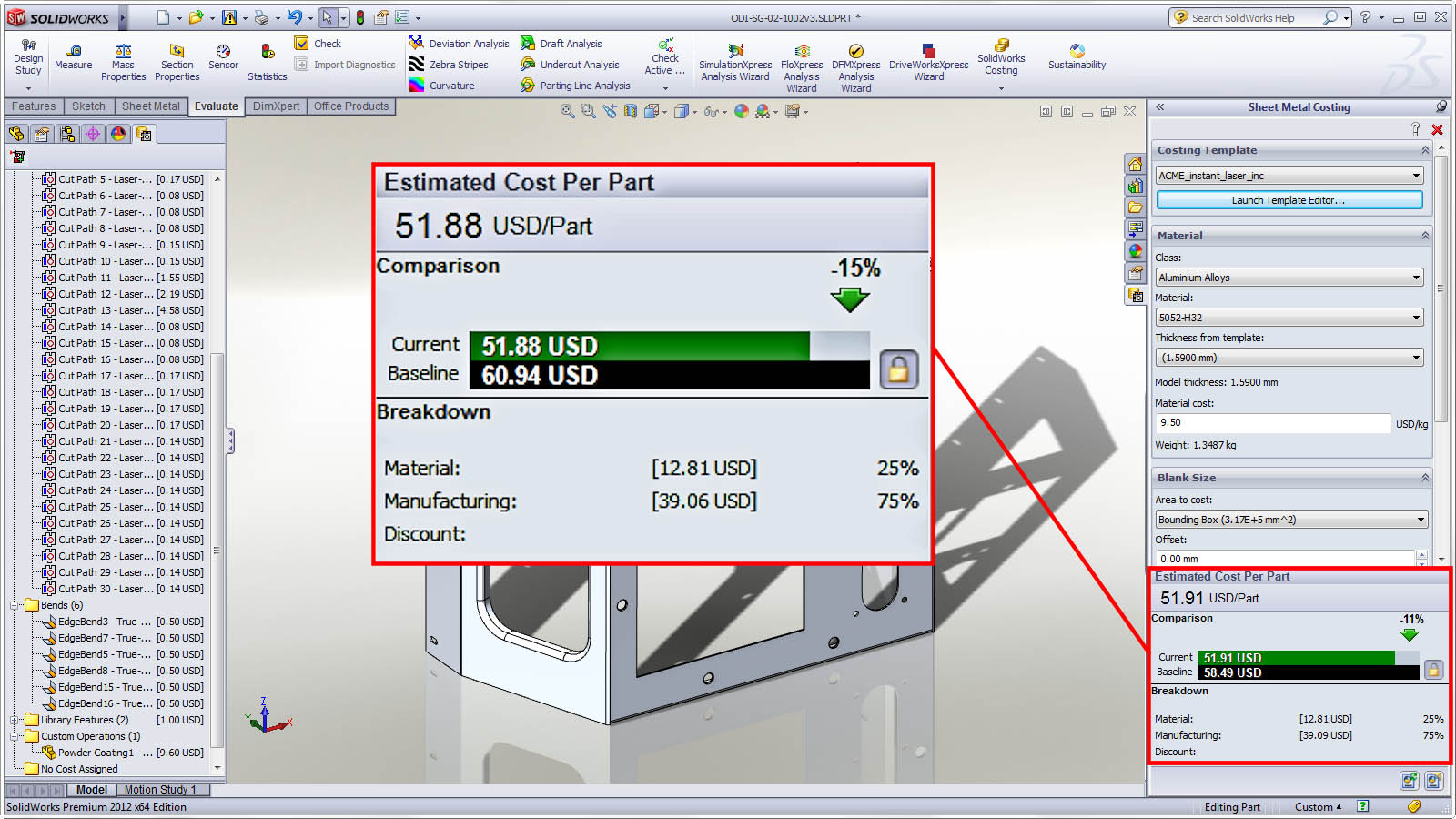 : Costing allows sheet metal and machined component costs to be instantly calculated inside SolidWorks Professional