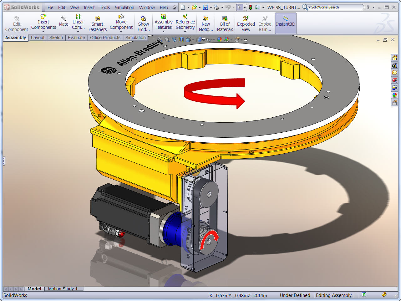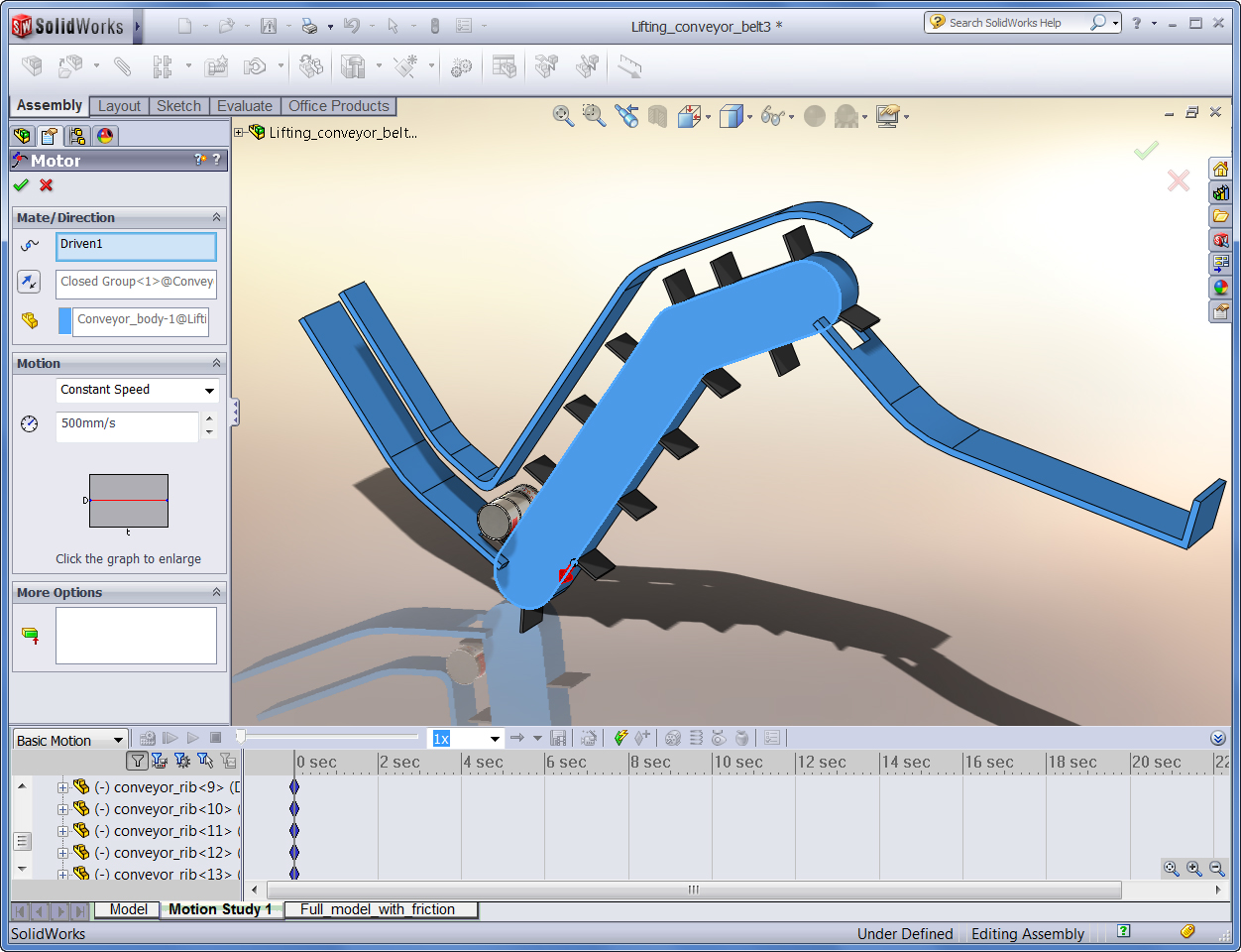 : In conveyors (or indeed chain, belt or pulley drive assemblies) the driven component’s velocity, displacement or acceleration is dependent upon where it is on the conveyors path. The new path mate motor moves locally along the path allowing the conveyor to be controlled as is would be in the real world, making for a more realistic simulation.