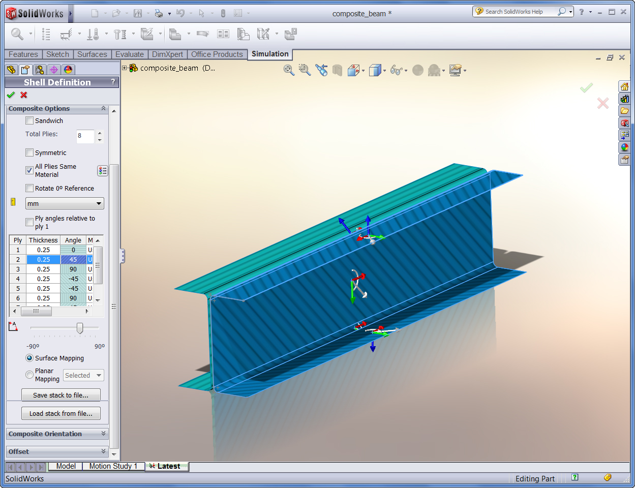 : The new shell and composite analysis tools are aimed at reducing the time and hassle of creating composite shells from solid or surface geometry. Setting the correct composite layup datum is a snap with the new shell offset tool. The enhanced ply orientation view ensures you get the layup orientation right first time. With the new composite stack save and load function it is easy to reuse a stack time and time again.