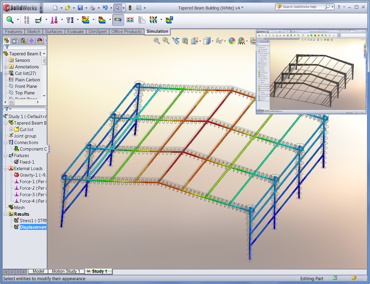 : For the efficient analysis of assemblies with long slender components, beam elements are an important tool. The beam analysis tools have seen considerable enhancements in this release. Beam elements can now be applied to tapered components with a constant cross section. The loads applied to the beam can now vary along its length and the mesh size for each beam can be set.