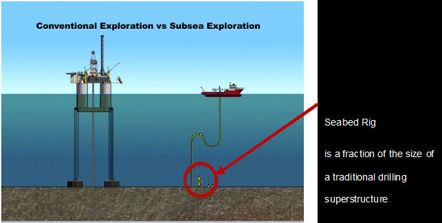 Remotely controlled from the surface vessel, the rig is filled with water, pressure-compensated, and encapsulated in order to avoid contamination of the surrounding environment. By requiring less machinery, construction, set-up, staffing, clean-up and tear-down, Seabed Rig will dramatically reduce the costs of oil and gas exploration in the deep seas and difficult Arctic regions.