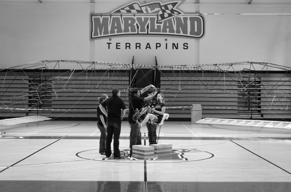 The UMD design team is pursuing a different type of flight: a human-powered helicopter, which runs on energy generated by pedals. While human-powered airplanes have been around for at least a quarter of a century, human-powered helicopters pose a much bigger challenge, as they need more power for flight height and duration. For example, a 60-second flight pushes the limits of human endurance.