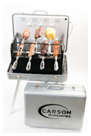 A versatile grill, the SolidWorks-designed Carson Rotisserie unfolds from sleek metal briefcase into a seven skewer, fully functional rotisserie grill that can cook all your favorite meats, fruits, and vegetables. With 4,000 cubic inches of cooking volume, chefs can grill for as many as 50 people without the stress of flipping anything or maintaining exact temperatures.