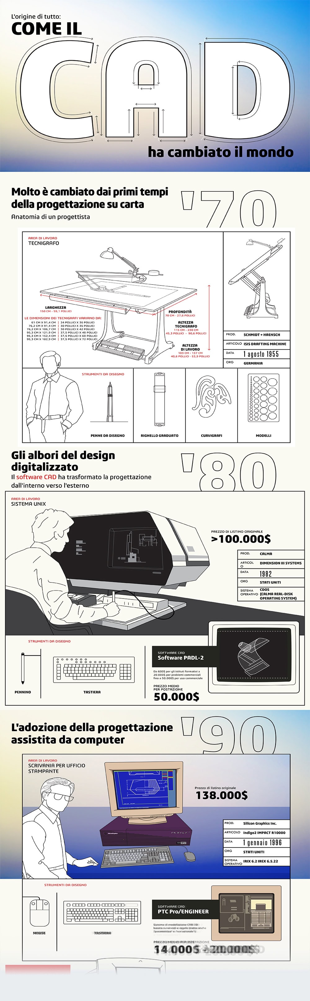 Scopri l'affascinante viaggio del software CAD e il suo impatto trasformativo sulla progettazione con la nostra analisi approfondita della storia della progettazione moderna. Dai primi giorni delle tavole da disegno agli strumenti all'avanguardia basati sull'intelligenza artificiale di oggi, SOLIDWORKS ha rivoluzionato la progettazione 3D, rendendola accessibile a settori e creatori in tutto il mondo. Scopri come questo potente software ha permesso ai progettisti di innovare in settori come quello delle macchine e degli impianti industriali, della robotica e dei prodotti di consumo, favorendo al contempo una vivace community globale di utenti, insegnanti e appassionati. Esplora il futuro della progettazione mentre SOLIDWORKS integra intelligenza artificiale e apprendimento automatico per semplificare i flussi di lavoro e sbloccare nuove possibilità per la prossima generazione di creatori. In che modo il CAD ha trasformato il mondo? Scoprilo in questa infografica.