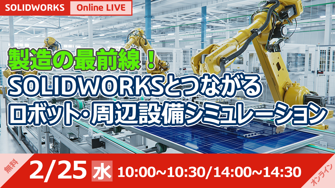 | 製造・生産技術 | 生産技術部門必見!SOLIDWORKSデータで業務効率と製品品質を同時に向上させる最新手法 生産技術でのMBOM/工程検討、ロボットシミュレーション、生産シミュレーションの概要と効果をご紹介します |