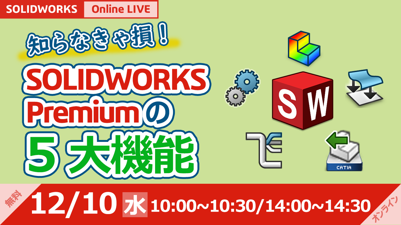 | 12/10 | ライブ配信型Webセミナー: 知らなきゃ損!SOLIDWORKS Premiumの5大機能 10:00~10:30 | お申し込みはこちら |